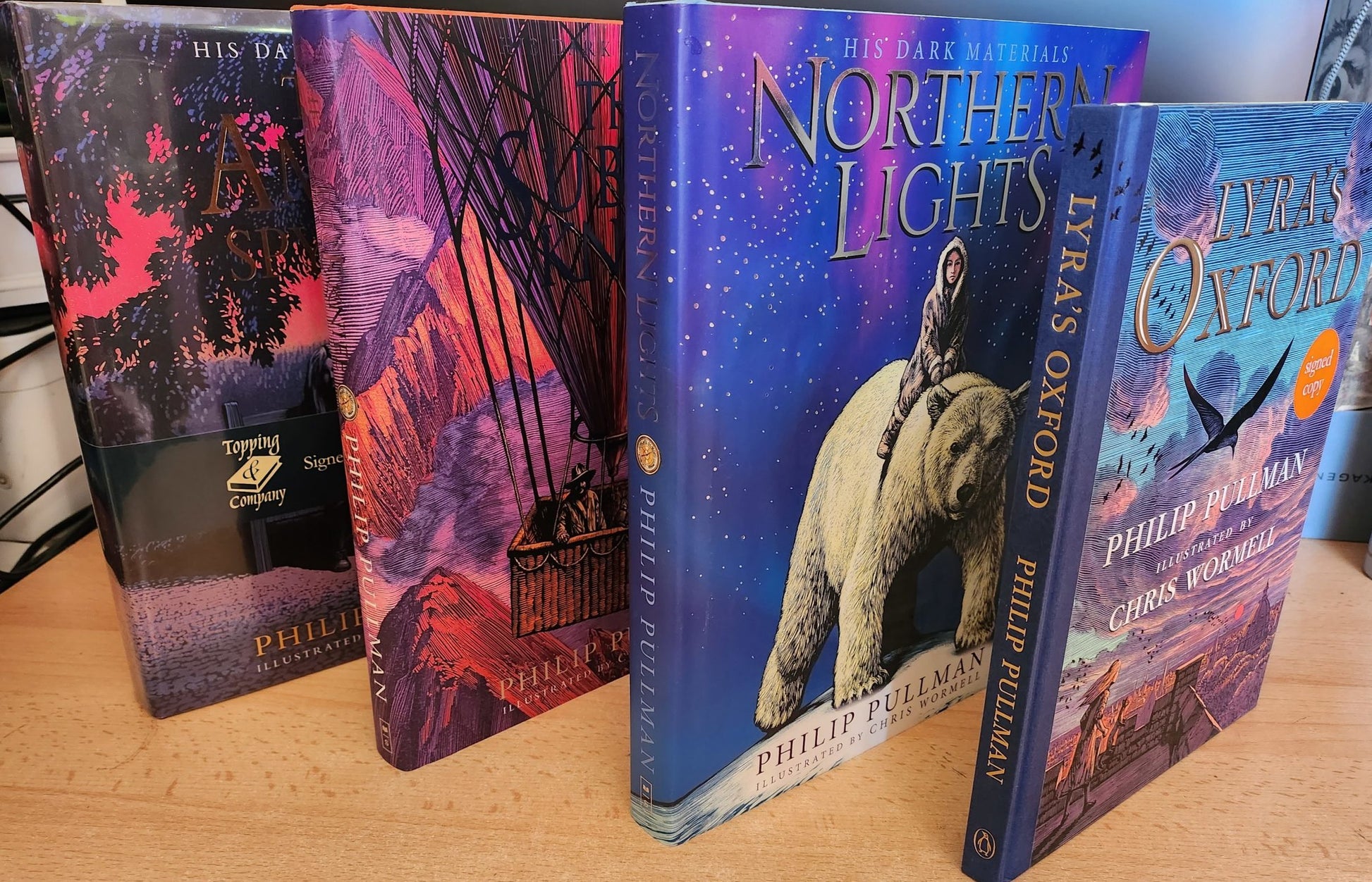 \nThese stunning coffee table editions are illustrated by Chris Wormell – and each book is double signed by both author and illustrator, except for The Amber Spyglass, which is signed by Pullman only.